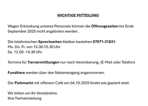 In dieser Zeit finden keine Tiervermittlungen statt.