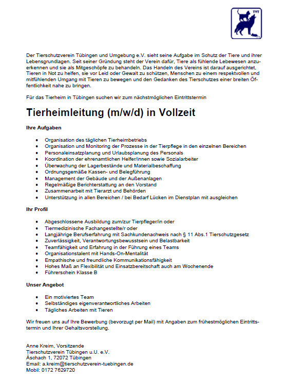 Wir freuen uns auf Ihre Bewerbung unter a.kreim@tierschutzverein-tuebingen.de